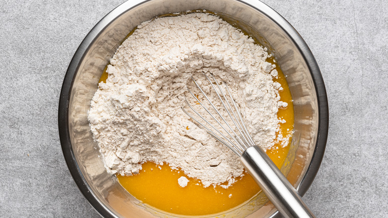 Mixing wet and dry ingredients together.